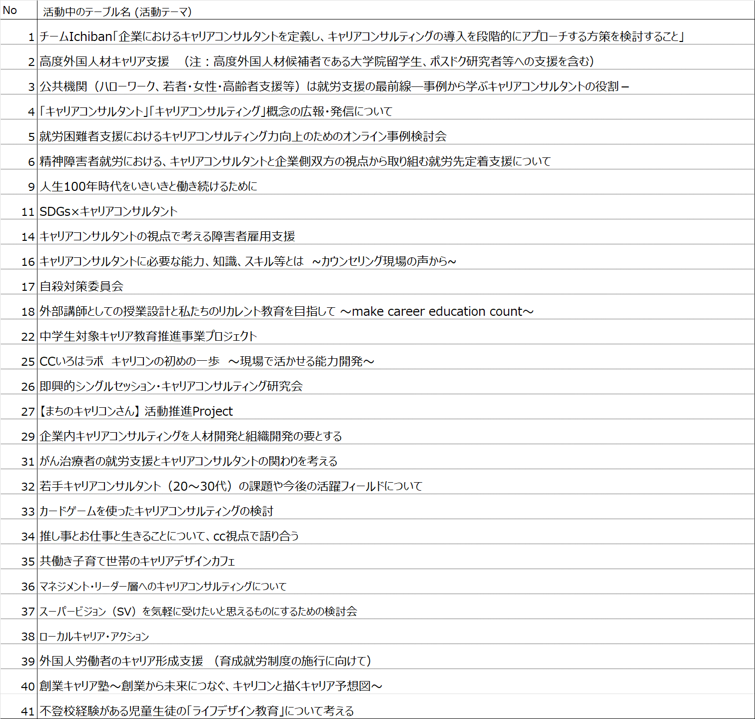 テーブルは、ACCN会員のキャリアコンサルタントが自主的に立ち上げ、継続的に運営している学びのコミュニティです。テーマは多岐にわたり、「若年支援」「企業内キャリア支援」「ミドル層キャリア」「ライフキャリア」「キャリア教育」「両立支援」「SV」など、関心のある領域ごとに集まり、対話し、実践を深めています。